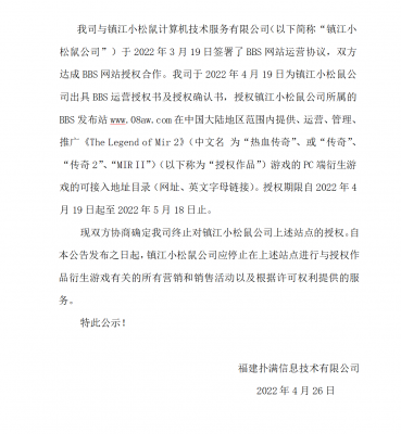 202204-26开云电竞信息技术有限公司(以下简称“我司”)自2021年获得《热血传奇》原始著作权人独占性授权,一直...